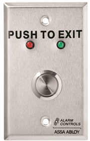 Single Gang, Wall Mount, Vandal Resistant Request to Exit Station, 3/4in Push Button, Momentary Action, Bi-Color Status LED, (Push to Exit), 12-24VDC, DPDT Relay, UL, 630/US32D Stainless Steel